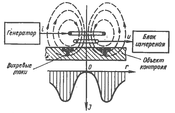 Рисунок 18. Схема вихретокового метода контроля и график распределения плотности вихревых токов (J – плотность вихревых токов, r – радиус контроля, i – ток возбуждения, u – напряжение измерительной обмотки)