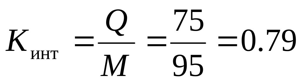 На предприятии мощность установленных станков составляет 95 тыс. шт. деталей в год. Фактически в отчетнм году было изготовлено 75 тыс. шт. деталей. Плановый фонд времени работы оборудования всего предприятия – 22 000 ч. в сутки. Фактически в отчетном периоде оборудование работало в среднем 15 500 ч. в сутки. Определить интегральный коэффициент использования обрудования.