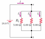 Three resistors are connected in parallel as shown in Figure. A potential difference of 18.0 V is maintained between points a and b. Calculate the equivalent resistance of the circuit.