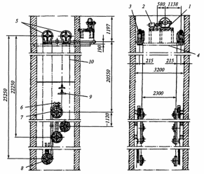 Автокоптилка малая АМ-360 (рис. 25.2) состоит из многоэтажной вертикальной кирпичной или железобетонной шахты размерами 2,52×3,2 м. Полезная нагрузка автокоптилки 12 420 кг. В верхней части располагается привод, который осуществляется от электродвигателя 2 через червячный редуктор 1 и цепную передачу 3. Посредством цепной передачи вращение передается на червячные редукторы 4. На вал червячного колеса этих редукторов насажены приводные звездочки 5, на которые навешиваются две бесконечные пластинчато-шарнирные цепи 10, движущиеся в вертикальном направлении. Цепи соединены между собой траверсами 9 люлечного типа, подвешенными на шарнирах так, что они все время сохраняют горизонтальное положение и предназначены для навешивания копченостей. Скорость движения цепи 0,016 м/с, а шаг между траверсами 900 мм. Цепи автокоптилки натягиваются двумя натяжными станциями 6 грузового типа. Они состоят из оси, вращающейся в двух подшипниках скольжения, смонтированных в ползунах, и двух звездочек 7 и 8, из которых одна фиксируется шпонкой, а другая насажена по скользящей посадке. В целях предотвращения аварии транспортного механизма автокоптилки предусмотрено специальное автоматическое устройство, которое включает электродвигатель привода с одновременной световой и звуковой сигнализациями при застопоривании одной из ветвей конвейера.