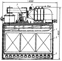 Термокамеры К7-ФТВ (рис. 25.5) представляют собой тупиковую камеру 1, в которой на монорельсе размещаются три клети 2 с обрабатываемым продуктом. Режимы обработки осуществляются последовательно после загрузки камеры. На камере размещен вентиляционно-нагревательный агрегат с центробежным вентилятором 3 и паровым калорифером 4. В процессе копчения дым вводится в вентиляционную систему 5 в нижнюю часть камеры.