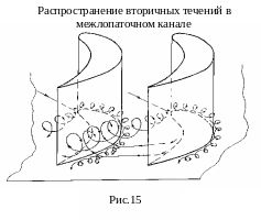 Под вторичными течениями понимаются области потока, где наблюдается самопроизвольное отклонение в направлении движения ограниченных масс по сравнению с основным направлением движения потока. Применительно к решеткам аэродинамических профилей вторичные течения приводят, например, к отличиям поворота струек жидкости, сообщаемого решеткой на различном удалении от торцевых стенок решетки. Предпосылкой возникновения вторичного течения является неравномерность распределения полных напоров в исходном потоке, а непосредственная причина порождения вторичного течения связана с тем или иным внешним воздействием, вызывающим в жидкости градиент давления, вектор которого не совпадает с вектором скорости в основном направлении, т. е. в направлении распространения потока.
