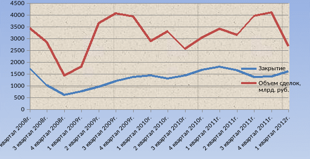 После достижения максимума в четвертом квартале 2011 года объем торгов существенно снижается и в первом квартале 2012 года оно равно 2670 млрд. рублей (снизилось более чем в 1,5 раза по сравнению с предыдущим кварталом).