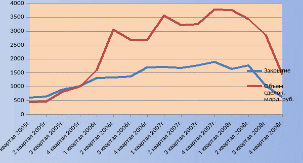 1350 млрд. рублей). После кризиса рынок начинает постепенно оживать, объем сделок начинает расти и в третьем квартале 2009 года достигает 3870 млрд. рублей (до кризиса максимальный объем сделок был равен 3510 млрд. рулей).
