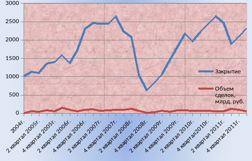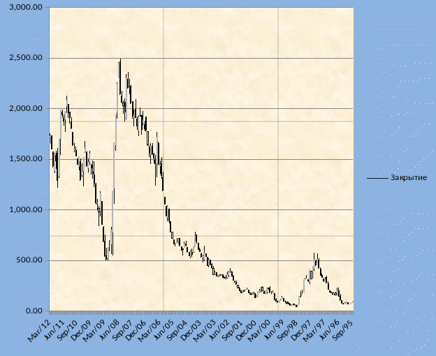 Каждый рабочий день Индекс РТС рассчитывается в течение торговой сессии при каждом изменении цены инструмента, включённого в список для его расчёта. Первое значение индекса является значением открытия, последнее значение индекса — значением закрытия. Список акций для расчёта индексов пересматривается раз в три месяца. На рисунке 8 представлена динамика индекса РТС с сентября 1995 года по март 2012 года.