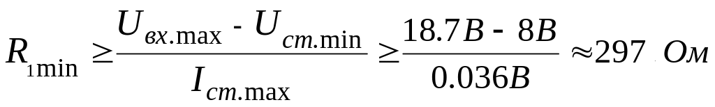При Uвх.max и R1min напряжение Uст и Iн , ток через стабилитрон не должен быть меньше Iст.min, в этом случае