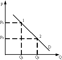 Движение по кривой спроса (D) показывает, как изменение цены (P) влияет на изменение объема спроса (Q). При этом положение кривой спроса D остается прежним, т.е. спрос на товар не изменился.