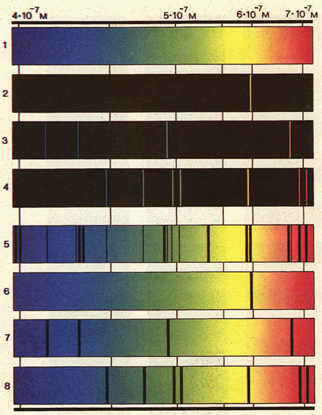 Рис. V Спектры испускания: 1 - сплошной; 2 - натрия; 3 - водорода; 4 - гелия. Спектры поглощения: 5 - солнечный; 6 - натрия; 7 - водорода; 8 - гелия.