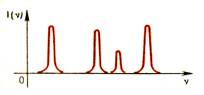Внесем в бледное пламя газовой горелки кусочек асбеста, смоченного раствором обыкновенной поваренной соли. При наблюдении пламени в спектроскоп на фоне едва различимого непрерывного спектра пламени вспыхнет яркая желтая линия (рис. V, 2). Эту желтую линию дают пары натрия, которые образуются при расщеплении молекул поваренной соли в пламени. На рисунке приведены также спектры водорода и гелия. Каждый из них — это частокол цветных линий различной яркости, разделенных широкими темными полосами. Такие спектры называютсялинейчатыми. Наличие линейчатого спектра означает, что вещество излучает свет только вполне определенных длин волн (точнее, в определенных очень узких спектральных интервалах). На рисунке 48 вы видите примерное распределение спектральной плотности интенсивности излучения в линейчатом спектре. Каждая линия имеет конечную ширину.