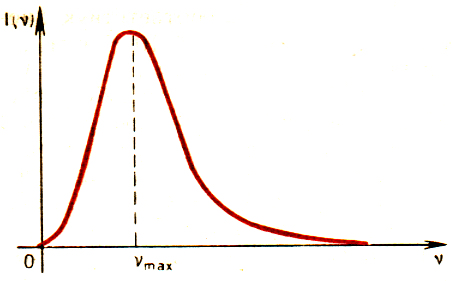 Распределение энергии по частотам, т. е. спектральная плотность интенсивности излучения, для различных тел различно. Например, тело с очень черной поверхностью излучает электромагнитные волны всех частот, но кривая зависимости спектральной плотности интенсивности излучения от частоты имеет максимум при определенной частоте max (рис. 47). Энергия излучения, приходящаяся на очень малые (0) и очень большие () частоты, ничтожно мала. При повышении температуры максимум спектральной плотности излучения смещается в сторону коротких волн.