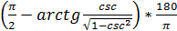 u2:=((pi/2)-arctan((csc)/(sqrt(1-csc*csc))))*180/pi;