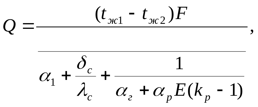 Тепловой поток, обусловленный теплопередачей между двумя средами, разделенными плоской стенкой, имеющей оребрение с одной стороны,
