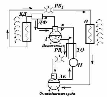 Г - генератор (кипятильник); АБ - абсорбер; КД - коденсатор; И -испаритель; Н - насос; РВ1 и РВ2 - регулирующие вентили