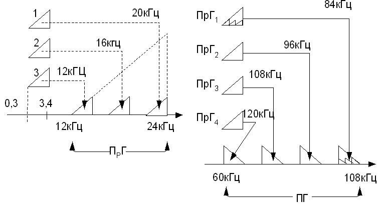 При формировании ТГ исп-ся одноступенчатая схема преобразования, аналогичная схеме построения ВГ (см. рис. 1). Преобразование осущ-ся с инверсией спектра, частотный зазор между преобразованными ВГ принят равным 8 кГц (рис.3). Групповые несущие формируются следующим образом: fгj=1364+( j – 1)∙248, кГц; j=1,2,…,5 . В качестве ГПФ исп-ся LC-фильтры.