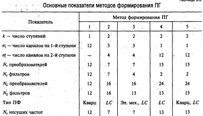 Существует несколько вариантов построения первичной группы, каждый из которых характеризуется совокупностью показателей, к которым относятся: число ступеней преобразования для формирования ПГ, число сигналов, объединяемых на каждой ступени преобразования, число разных типов преобразователей частоты, фильтров, несущих частот, общее число преобразователей и фильтров, тип полосовых канальных фильтров.