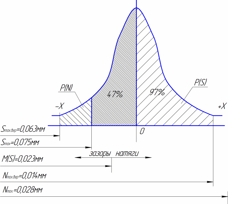 Из расчетов видно, что вероятность зазора 98%, а вероятность натяга - 2%. Строим кривую Гаусса: