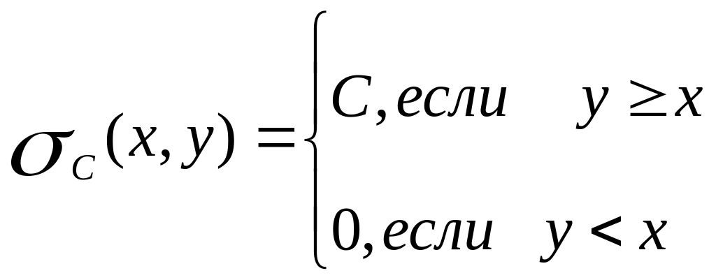 4.2.1 Скачкообразные системы стимулирования. Такая система названа системой С-типа и характеризуется тем, что агент получает постоянное вознаграждение (как правило, равное максимально возможному или заранее установленному значению) при условии, что выбранное им действие не меньше заданного; и нулевое вознаграждение при выборе меньших действий (рисунок 4.1):