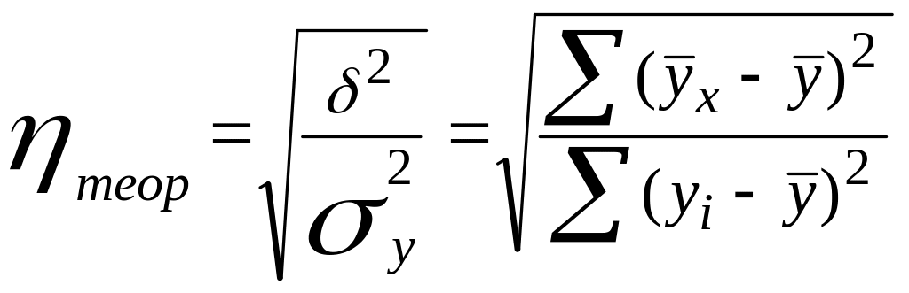 который показывает, какую долю в общей дисперсии результативного признака занимает дисперсия, выражающая влияние вариации фактора x на вариацию y. Извлекая корень квадратный из коэффициента детерминации, получаем теоретическое корреляционное отношение