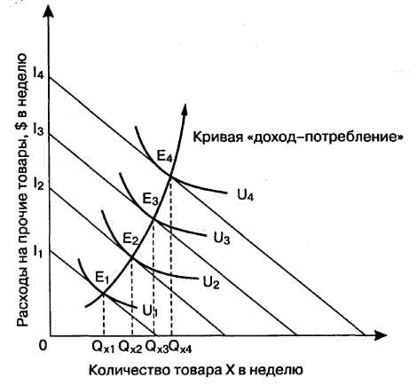 Увеличение доходов дает возможность приобретать такие блага, которые потребитель прежде не мог приобрести. Это вызывает перемещение равновесия к новой точке - Е2. Еженедельное потребление блага X - QX2 увеличилось в ответ на увеличение доходов.