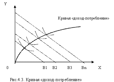 С ростом реального дохода бюджетное ограничение сдвигается последовательно в положение В1, В2, В3, …, Вn. Точки касания кривых безразличия с бюджетными ограничениями показывают последовательные положения равновесия потребителя в соответствии с ростом его дохода.