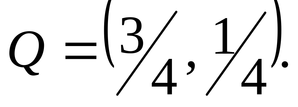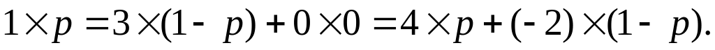 Возьмем верхнюю огибающую. Это ломаная ABCD. Точка В – это точка с наименьшей второй координатой на этой огибающей. Точка В – это точка пересечения прямых (1) и (2). Поэтому припишем 1-й строке вероятность p, а 2-й строке – вероятность 1 – p. Оставшейся строке припишем нулевую вероятность.