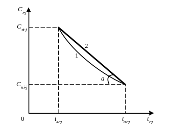 Сокращение продолжительности работы требует привлечения на неё дополнительных ресурсов. В общем случае зависимость между продолжительностью работы ti-j и затратами Ci-j на её выполнение нелинейная (кривая 1 на рис. 6.21), которую для упрощения расчетов аппроксимируют прямой линией (прямая 2 на рис. 6.21).