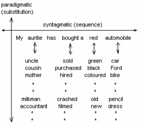 The basic relations between words in language and speech are paradigmatic and syntagmatic (F.de Saussure). Lexemes are related along two intersecting dimensions: horizontal and vertical. The syntagmatic relations are the relations of lexemes in a sequence, which means that they occur in collocation (combinations) with other lexemes in word combinations, sentences, texts. On the vertical dimension, we sense the way in which one lexeme can substitute for another, and relate to it in meaning. Prof. D.Crystal illustrates the paradigmatic and syntagmatic relations by the following scheme [Crystal 1995: 160]: