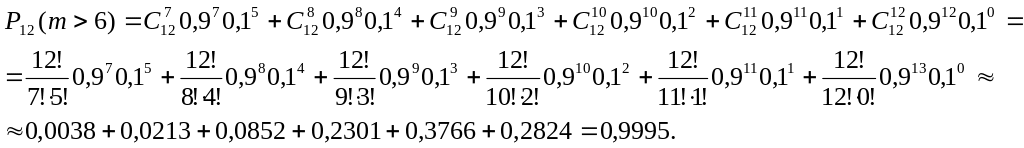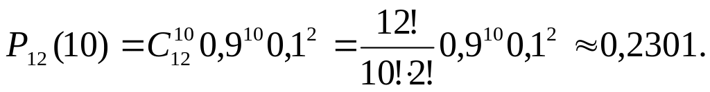 Пример 4.1. После года хранения на складе в среднем 10% аккумуляторов выходит из строя. Определить вероятность того, что после года хранения из 12 аккумуляторов окажутся годными: