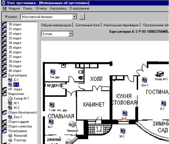База по комп’ютерам 5.1.235 – база даних дозволяє інвентаризувати комп'ютери, копіри і мережеві концентратори на Вашому підприємстві чи фірмі. Програма призначена в основному для системних адміністраторів, яким ставиться завдання систематизувати облік комп'ютерної техніки. Програма дозволяє вказувати на плані підприємства розташування кожного конкретного комп'ютера і всіх інших комп'ютерів на поверсі. Є можливість вести облік копірів, мережевих концентраторів та іншої оргтехніки, можливість використовувати сканер штрих-коду. Додана звітність відповідно до поточного законодавства. Головна сторінка бази даних представлена на рисунку 2.3.
