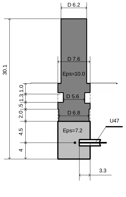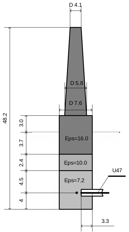 Круговая поляризация возбуждается двумя ортогональными зондами, конструктивно выполненные как коаксиально-волноводные переходы (на рисунках показан один из них). В качестве зонда используется внутренняя жила кабеля U47