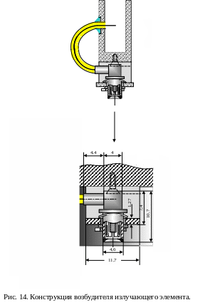 Возбуждение элемента (рис. 14) осуществляется отрезком прямолинейного металлического проводника, являющегося центральной жилой полужесткого кабеля, вводимого в волновод через коаксиально-волноводный переход (КВП) в боковой стенке. Заделка кабеля в месте стыка с волноводом производится посредством пайки. Другой конец фидерного кабеля запаян в плавающий врубной уголковый СВЧ разъем типа AEP P/N 7335-1571-10 (под полужесткий кабель диаметром 0,085 дюйма (2,16 мм) типа RG405, M17/133). Разъем монтируется в стакане во входной части элемента в пластину толщиной 1,27 мм, которая крепится винтами к торцу волновода. Указанная пластина с закрепленными на ней 16-ю излучателями образует блок излучателей МКППМ. Ответные части врубных СВЧ разъемов являются СВЧ выходами МКППМ со стороны излучения. СВЧ контакт (стыковка) с МКППМ с блоком излучателей происходит при креплении последнего к торцу МКППМ. Недостатком описанной конструкции возбуждения излучателей является необходимость изгиба питающего СВЧ кабеля при его заводке в стакан возбудителя и требуемое место для торчащих вбок петлей кабелей.