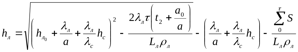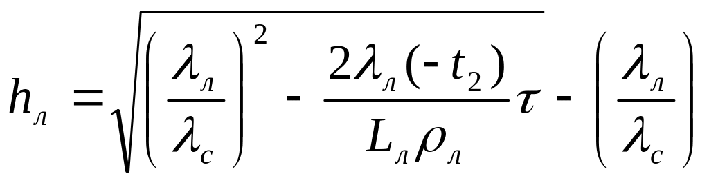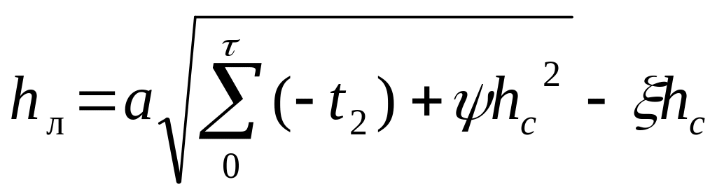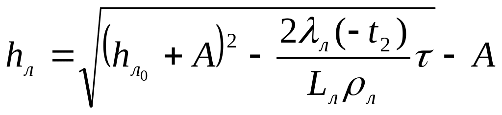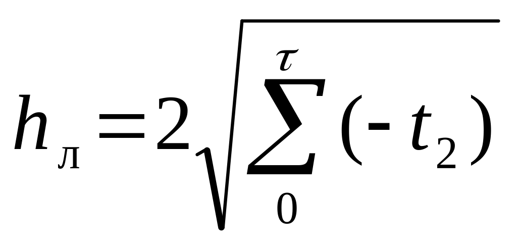 Здесь - искомая толщина льда, м; - начальная толщина льда, м; и - коэффициенты теплопроводности льда и снега, Вт/(м оС); - толщина снега на льду, м; - коэффициент теплообмена льда или снега с атмосферой, Вт/(м оС); – удельная теплота ледообразования, равная 335 кДж/кг; - плотность льда, 910 кг/м3; - продолжительность расчетного интервала времени, с.