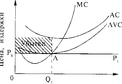 Цена установилась на таком уровне, что фирма не возмещает даже минимальных средних переменных издержек производства (Р < min AVC). Такая фирма называется запредельной. Она имеет убытки, но объема производства, при котором их можно минимизировать, не существует. На графике убытки показаны заштрихованным прямоугольником. Фирме выгоднее прекратить производственную деятельность, чем производить при данной цене, так как в первом случае ее убытки равны средним постоянным издержкам, а во втором - превышают их.