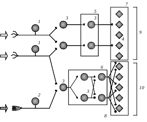 1 – чувствительные нейроны одной сенсорной системы, 2 – чувствительный нейрон другой сенсорной системы, 3 – нейрон ЦНС, 4 – корковый нейрон, 5 – таламус, 6 – ретикулярная формация, 7 – проекционная зона коры, 8 – ассоциативная зона коры, 9 – специфический проводящий путь, 10 - неспецифический проводящий путь.
