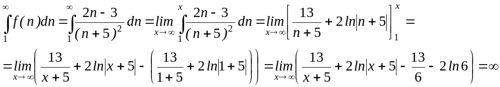 и он расходится согласно интегральному признаку сходимости для положительных рядов, так как каждый член положительного ряда меньше предшествующего и несобственный интеграл расходится, равен :