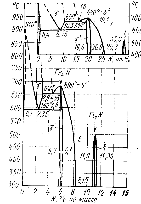 Левая часть диаграммы аналогична диаграмме Fe—С, с той лишь разницей, что растворимость азота в азотистом феррите (-фаза) больше—0,1,% вес. при эвтектоидной температуре 590°С, а содержание азота в азотистом аустените (γ-фаза) при эвтектоидной температуре составляет 2,35%. В системе Fe—N железо образует три нитрида: Fe4N ( ’-фаза) с узкой областью гомогенности, Fe2-3N (ε- фаза) — твердый раствор с широкой областью гомогенности и F2N (-фаза).