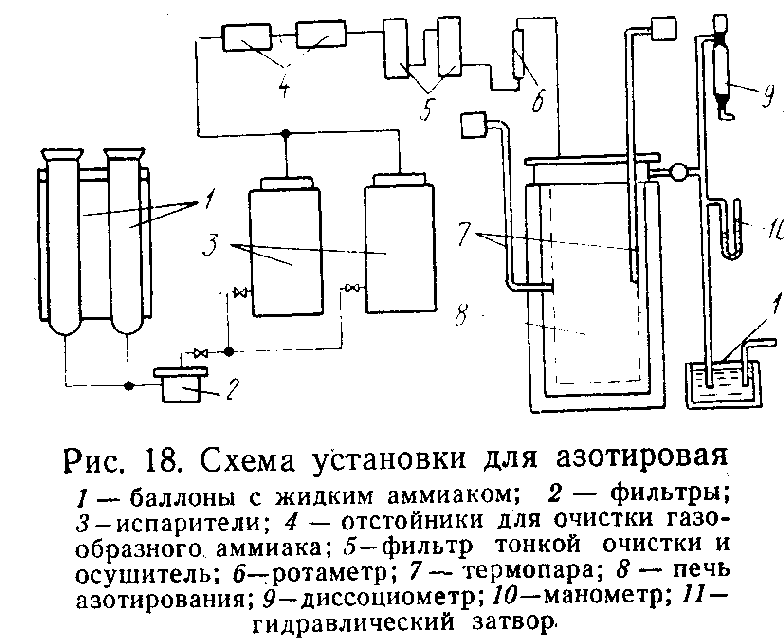 На рис. 18 показана технологическая схема установки для азотирования. Жидкий аммиак из баллонов через ротаметры, систему осушки и испаритель (при больших расходах аммиака) подается в рабочее пространство печи.