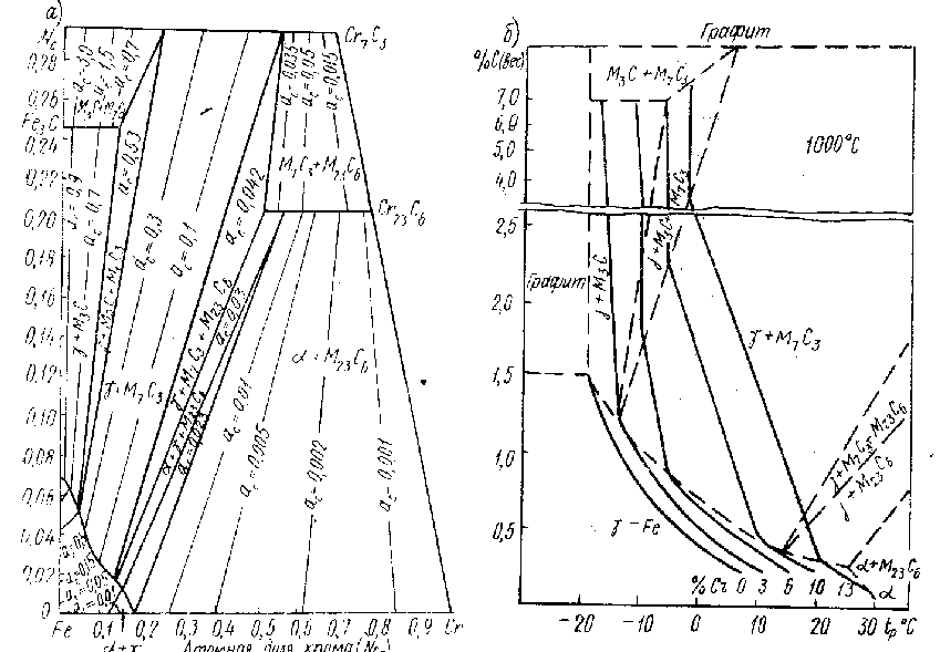 Рис. 4. Изотермические разрезы диаграммы Fe—Сr—С при 1000°: а— линии изоактивности углерода (Т. Нишизава), б—диаграмма равновесия компонентов эндогаза с углеродом сталей с различным содержанием хрома