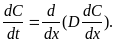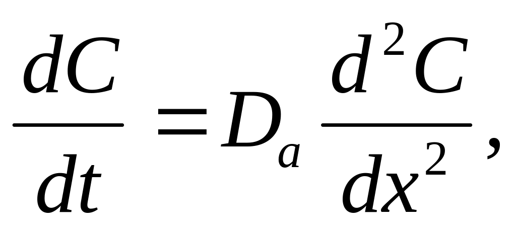 Так как dJ/dx , т.е. разность потоков эквивалента скорости изменения концентрации с обратным знаком, т.е. – dC/dt, получаем уравнение второго закона Фика .