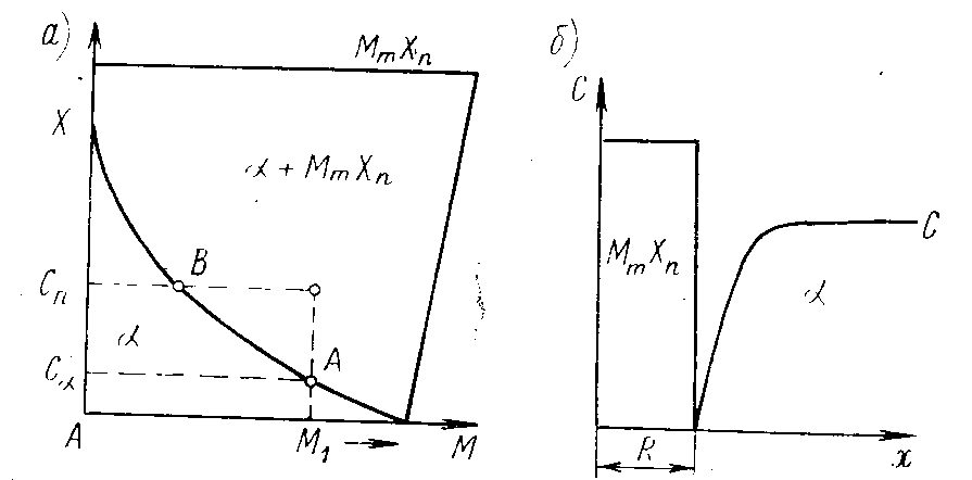 Если равновесные условия приводят к концентрации быстро диффундирующего элемента X, равной Сп, то твердый раствор пересыщается выше концентрации Са с образованием соединения МmХn. Место роста выделения радиусом R в этом случае будет являться стоком для атомов элемента Х (рис. 8, б) и легирующего элемента М, причем скорость роста будет определяться как соотношением скоростей диффузии обоих элементов в твердом растворе, так и их концентрацией в соединении МmХn.