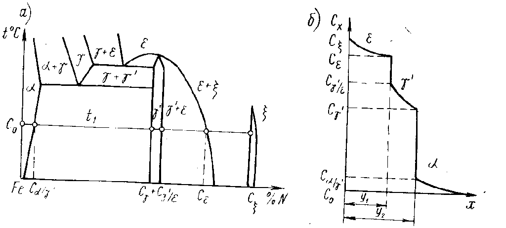 Рис. 7. Схематическое изображение диаграммы Fe—N(a) и схема роста фаз при азотировании при температуре t1(6)