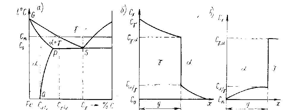 Поясним описание реактивной диффузии наиболее простым частным примером (рис. 6). В системе Fe—С (рис. 6, а) при концентрации Сγ , определяемой внешними условиями, происходит науглероживание феррита с начальной концентрацией Со.