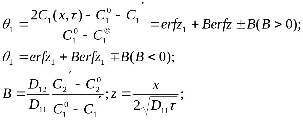 С1(x, τ)-концентрация углерода в слое x в момент времени τ; С10и С1’ начальные концентрации углерода при x<0 и x>0 соответственно.