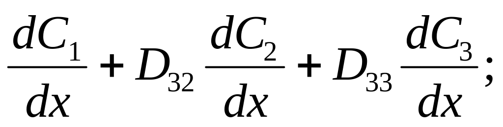 где C1, С2—концентрация элементов 1 и 2 в основе элемента 3 (C1+C2+Сз=1); D11, D22, Dзз—коэффициенты диффузии элементов 1, 2 и 3 в сплаве; D12, D13, —кинетические коэффициенты, учитывающие взаимовлияние потоков одних элементов на другие.
