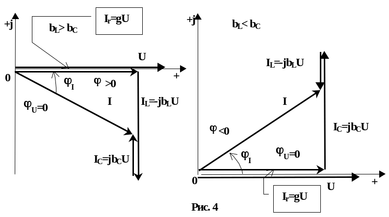 В первом случае комплексная проводимость цепи имеет индуктивный характер, во втором - емкостной.