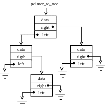 тут TREE — ідентифікатор структури типу “бінарне дерево”, var_tree — змінна типу “бінарне дерево” (вершина дерева), pointer_to_tree — вказівник на дерево (може бути порожнім — null), left — поле, що вказує на ліве піддерево (якщо null, то дана вершина не має лівого піддерева), right — поле, що вказує на праве піддерево, data — корисні дані типу SOMETYPE (наприклад, ціле число або вказівник на якийсь складніший тип даних).