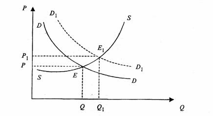 Однако состояние равновесия спроса и предложения никогда не бывает статичным из-за большого количества влияющих на эти процессы факторов. Следствием этого влияния является постоянное смещение кривых спроса и предложения (вправо или влево, вверх или вниз), в результате которого происходит нарушение равновесия. Новое равновесие устанавливается в другой точке, например, в точке E 1 , которой будет соответствовать новая рыночная цена Р 1 (рис. 3). Практика знает много случаев, когда «инициатором» нарушения равновесия выступает как спрос, так и предложение.