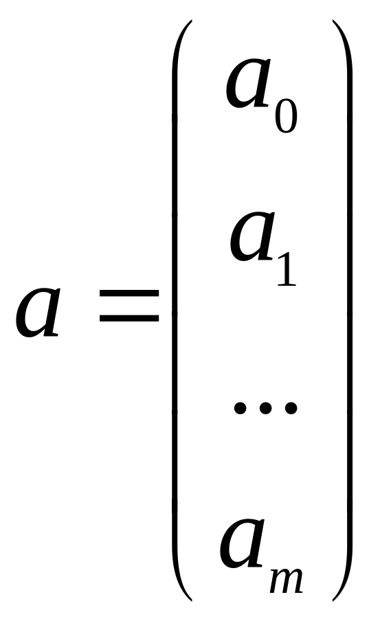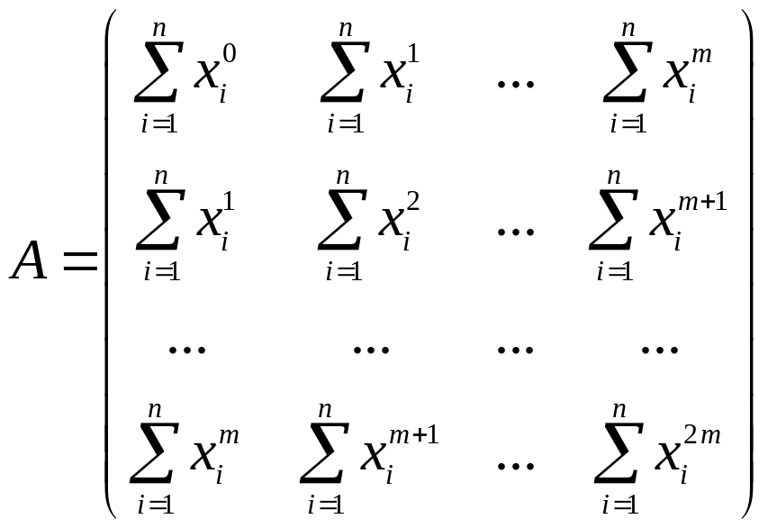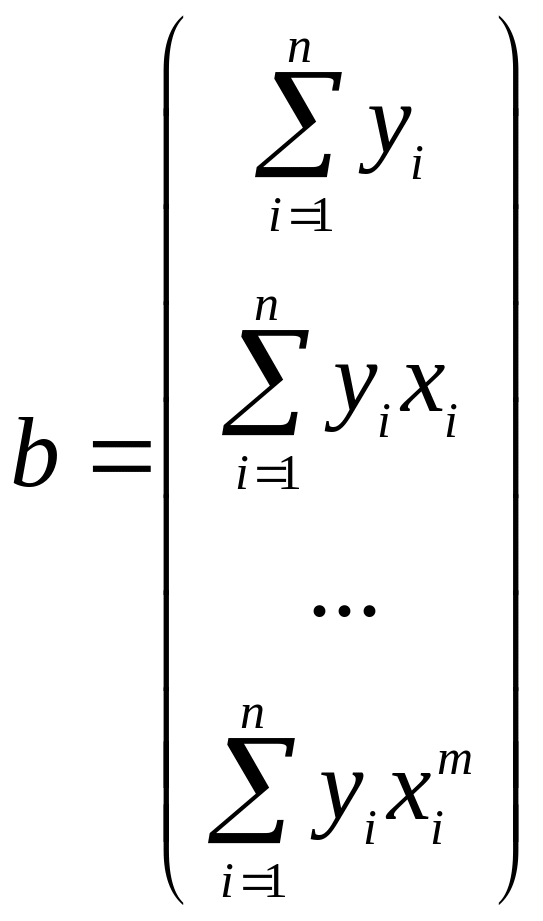 Систему линейных уравнений удобно представить в матричном обозначении Aa = b. Матрица A - квадратная симметричная матрица, a - вектор коэффициентов полинома, b - вектор свободных членов.