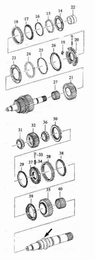 22. Удалите фиксаторы и пружины. Подхватите косозубую шестерню 3-ей передачи (35) двух - или трехзахватным съемником и снимите вместе с роликоподшипником (36), ступицей синхронизатора (37), кольцом синхронизатора (38) и зубчатой муфтой (39).