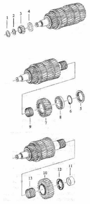 10. Косозубую шестерню 1-ой передачи (10) подхватите двух - или трехзахватным съемником и снимите вместе с втулкой- (11) и зубчатой муфтой (12) (используйте проставку).